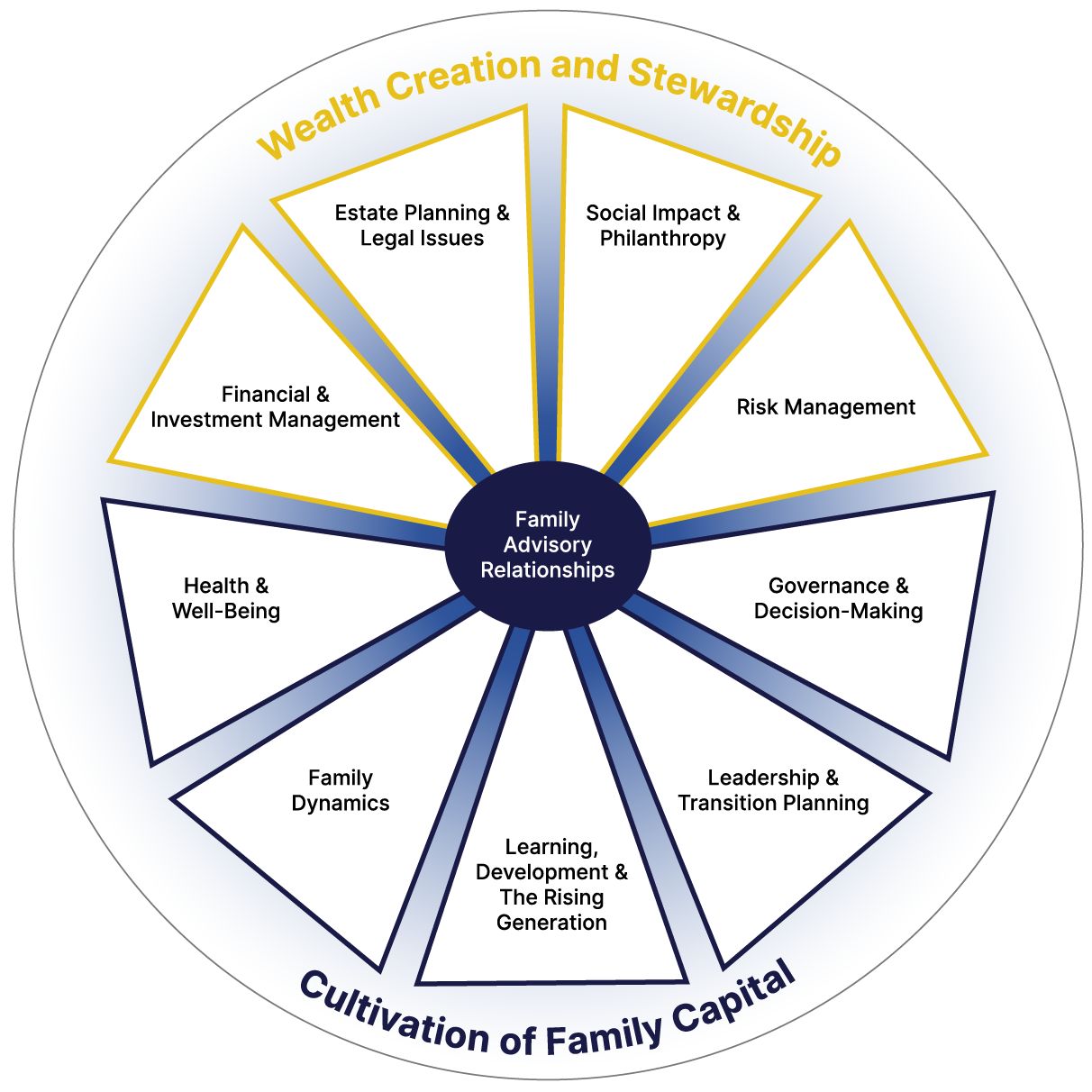 A comprehensive framework for understanding the needs and issues facing UHNW families across generations. Each domain represents an area in which UHNW clients and families require services from their advisors, family offices, and other wealth advisory professionals.
